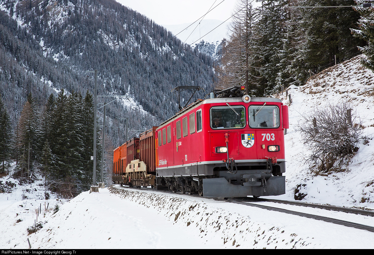 | Finally, Grisons got a few inches of snow yesterday! Locomotive Ge 6/6 II # 703 "St.Moritz" with the short freight 5135 from Landquart to Pontresina on the Albula line in the Val Tisch (Tisch valley) between Bergün and Muot. |