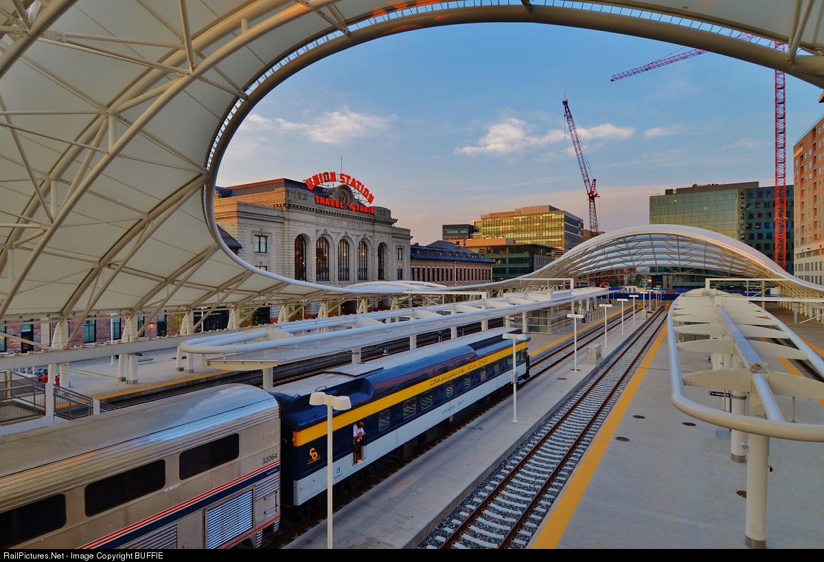 Dawn begins to break as the morning California Zephyr, under the watchful eyes of the crewman of the private car Chapel Hill No3, backs into the newly renovated Denver Union Station. The new station platform incorporates a sweeping canopy and the many shops inside of the main building offer food, books, and Denver souvenirs.