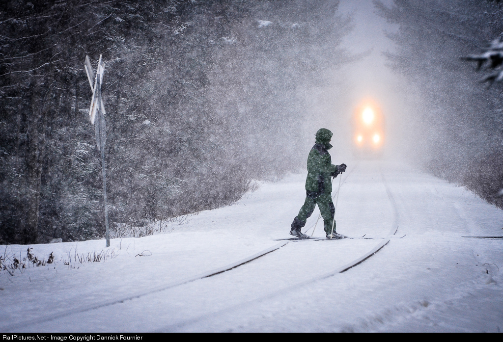 CFS 1828 to Joffre by a snowy afternoon and a skier cross the track.