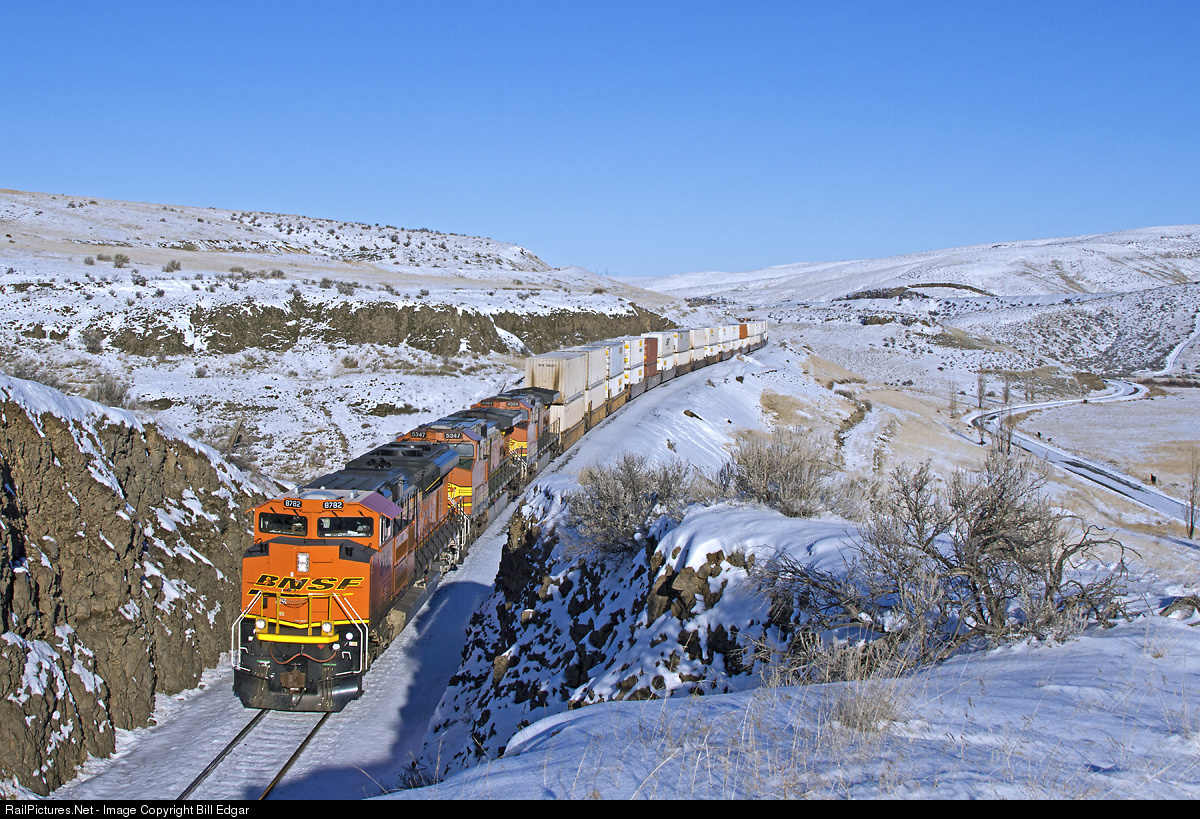 | A nice way to end the year. Shiny SD70ACe BNSF 8782 keeps a Z train under control as it descends the grade from Quincy to Albus (Columbia River) siding through Trinidad Loop. Shown here at MP 1625 the train has made it through the loop and is starting to accelerate again, and will increase speed form about 25mph to about 50 mph by the time the Fred goes by. |