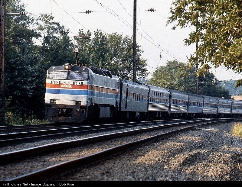 The 953 rounds the big curve at Aberdeen with one of the Florida-bound trains; probably either "The Silver Meteor" or "The Champion," due in Baltimore a little after 6:00 p.m. and 7:00 p.m., respectively. No. 953 was built by GE for Amtrak in November, 1975.