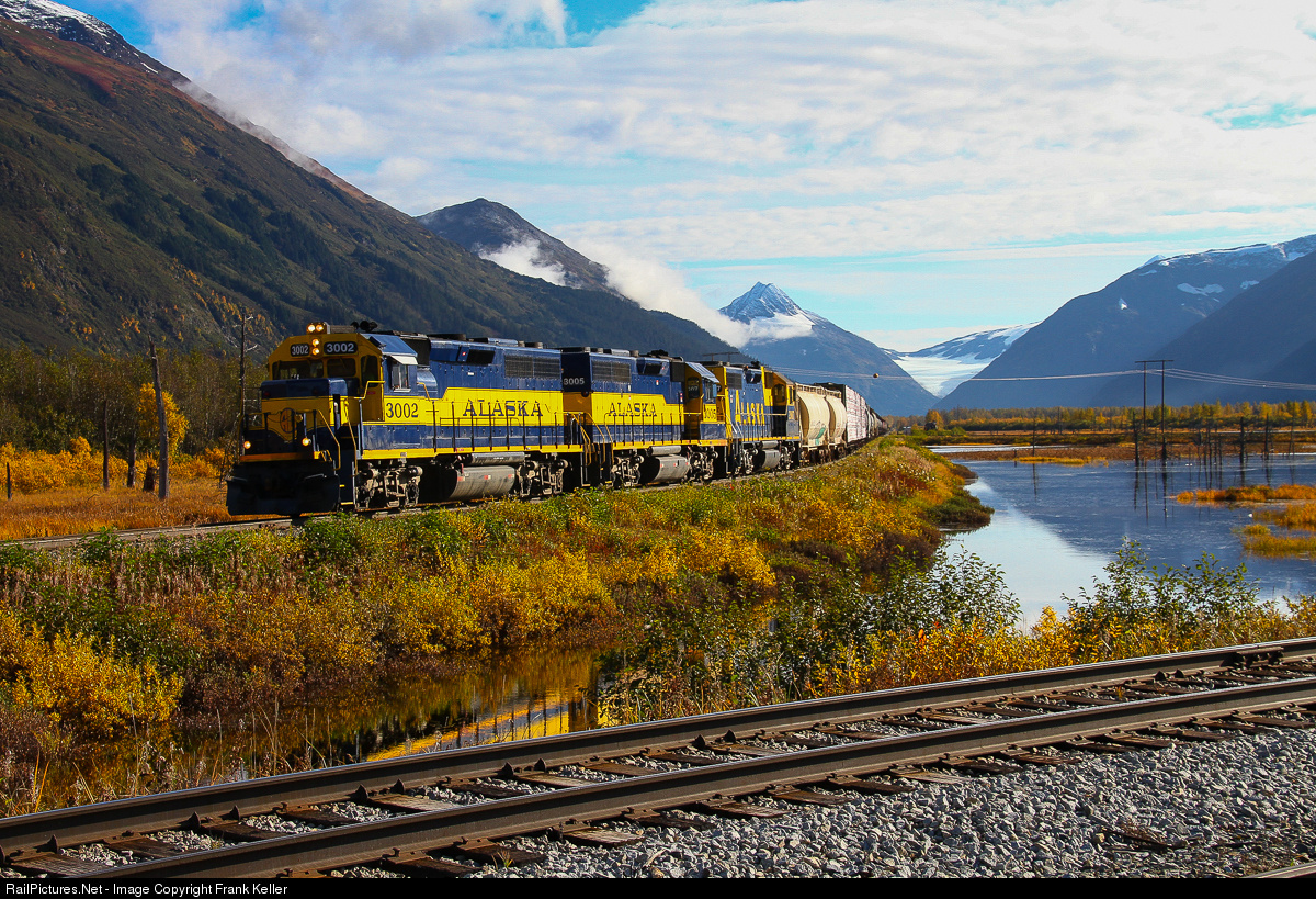 | 3002 is exiting the branch from Whittier and entering the mainline at Portage for the remaining 50 miles to Anchorage. In Anchorage this train will switched out for local Anchorage customers and the remaining cars will continue north to Fairbanks in the following days. |