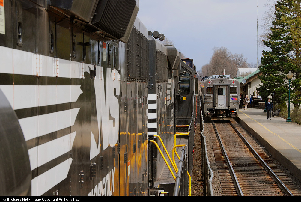 A Westbound New Jersey Transit train makes the station stop as seen from Eastbound NS H82.