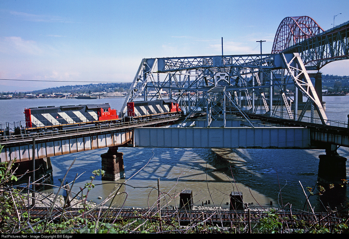 | A CN transfer from the Vancouver area to Thornton Yard enters the east wye of the Fraser River CN/SRY/BNSF bridge which is situated immediately east of the Pattullo highway bridge which connects New Westminster with Surrey, BC. This is a draw bridge which permits commercial water traffic to move up the Fraser River as well as serving the three railroads plus Amtrak. In this view the railroads were still CN/BC Hydro/BN. The CP also uses foreground trackage to reach New Westminster from their Pt. Coquitlam yard east of Vancouver. |