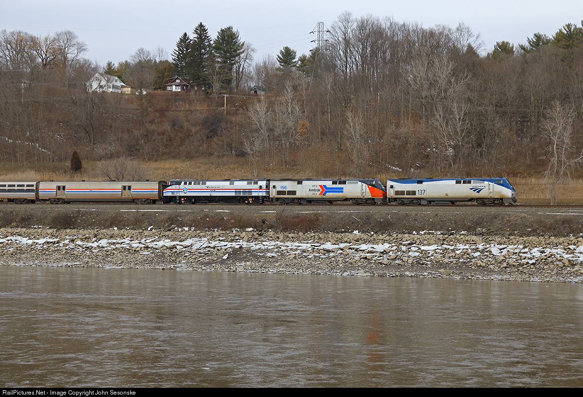 | The EB Lake Shore Limited rolls along the Mohawk River and Erie Canal at Lock 10 with 3 units in 3 schemes. The Phase I heritage trails the regular power set and the first repainted Empire Service dual mode, 704, trails the 156. The 704 is on the way back to it's Rensselaer base after getting a new paint job at Beech Grove. The unit is painted in Phase III with the current Amtrak logo and an Empire Service logo.