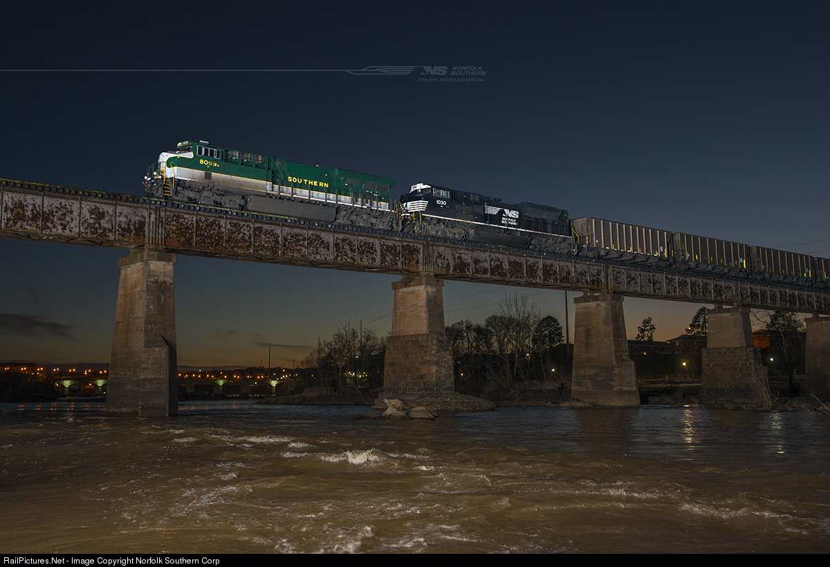 Norfolk Southern's "Southern Railway" heritage unit, GE ES44AC number 8099, works in DPU mode (distributed power), bringing up the rear of an empty Scherer coal train as it crosses the Chattahoochee River departing Columbus, Georgia. This is a rare scene for several reasons: These coal trains are normally powered by BNSF locomotives, but several train sets are currently utilizing NS power. This set happens to have the one-of-a-kind Southern unit, along with EMD SD70ACe number 1030, which many might remember as the "honorary heritage unit" used at the heritage gathering in July 2012 at Spencer, NC, to represent the current NS paint scheme. After the coal is loaded in the Powder River Basin in Wyoming, the Scherer trains are usually routed from BNSF in Memphis to Sheffield, AL, Chattanooga, TN, Atlanta, and to Georgia Power's Plant Scherer (north of Macon, GA). The empties usually return the reverse route, but occasionally are re-routed via Birmingham, Alabama, to ease congestion through Atlanta and Chattanooga. One of the alternate return routes is pictured here, the former Central of Georgia district from Macon to Columbus, Georgia, and on to Birmingham. Photo by Casey Thomason. For more information about Norfolk Southern, visit www.nscorp.com