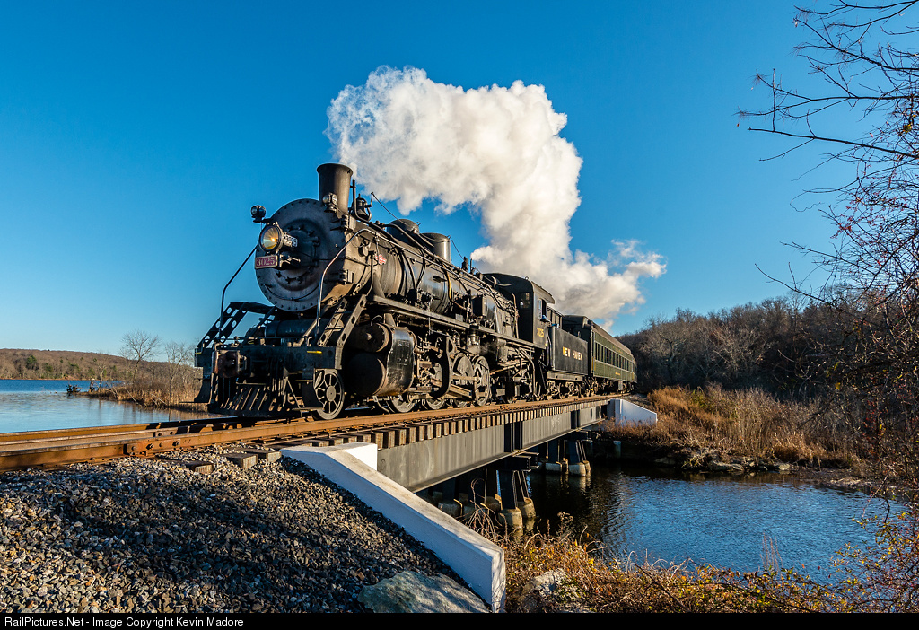 The Valley Railroad operates on 7 miles of the former New York, New Haven & Hartford's Connecticut Valley Line. Running along the shores of the mighty Connecticut River, this popular tourist line crosses numerous estuaries, the widest of which is the one seen here. It's been years since I managed a sunny shot here. The lighting at this location is arguably at its very best in late November and December, but alas, the sun rarely seems to be out when I am visiting during these times. The 3025 has now been in service for 4 years and I can't tell you how many times I've tried for this shot in that time, only to be skunked by clouds. Fortunately, the last day of Thanksgiving Weekend 2015 turned out to be the charm. Clear sky, pretty light, nice, white plume!