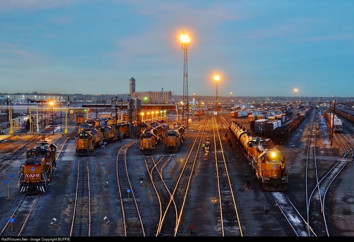 It is dusk and operations at the UP North Yard in Denver are winding down under the glow of the massive yard lights. The last move of the evening will be UP 3457 (SD40-2) placing the oil cans at the fuel island.