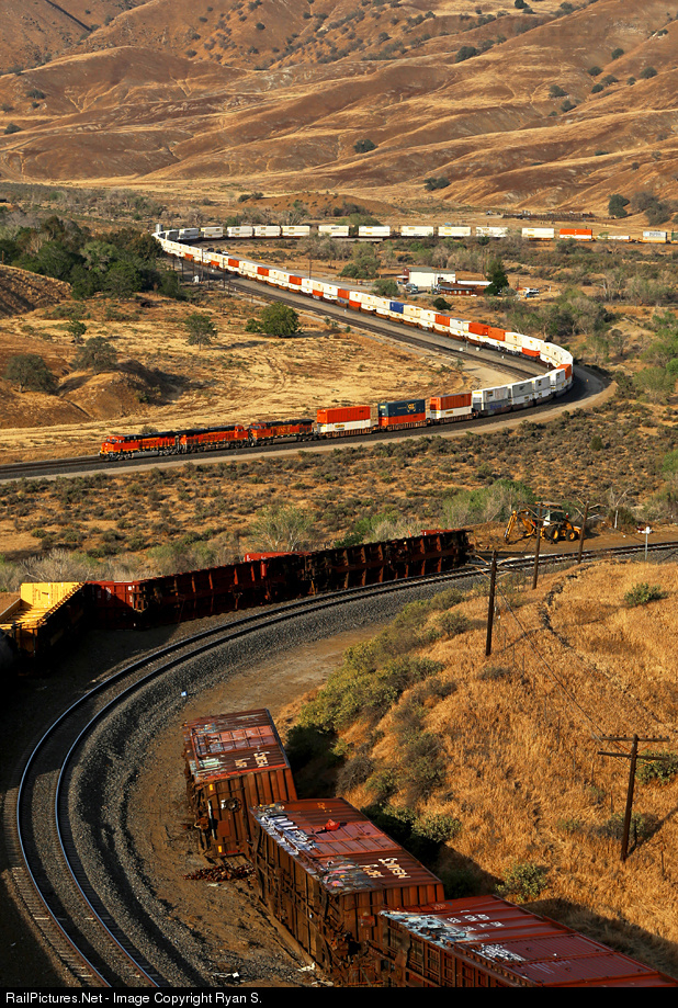 Southern California's Tehachapi Mountains are perhaps best known for the mountain railroad spectacle which takes place in these fabled hills on a daily basis. The countless curves and tremendous gain in elevation on its western slope still provide the very definition of mountain railroading in North America. What's just as impressive was that all of this was hammered into being back in the 1870s with hand tools, blasting powder, and of course hard labor under direction of William Hood of the Southern Pacific railroad. While Tehachapi's serpentine curves, series of tunnels, and daunting grades are something to behold trackside, the seasoned crews who work the mountain are constantly at odds with what makes Tehachapi so irresistible. Cast in a late afternoon's glow a westbound BNSF double stack train slips through 'downtown' Caliente, negotiating the lower leg of the Caliente horseshoe and the horseshoe curve itself. Lining the upper leg of the horseshoe, in the foreground, the remains of a UP MWCRV derailment line the Mojave Subdivision just out of tunnel 1's west portal.