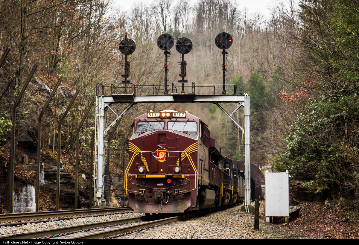 | The Pennsylvania heritage unit shoves an eastbound coal train through the tunnel at Elkhorn. While these signals still stand, the mast for the new Safetrans signals is standing behind me here. |