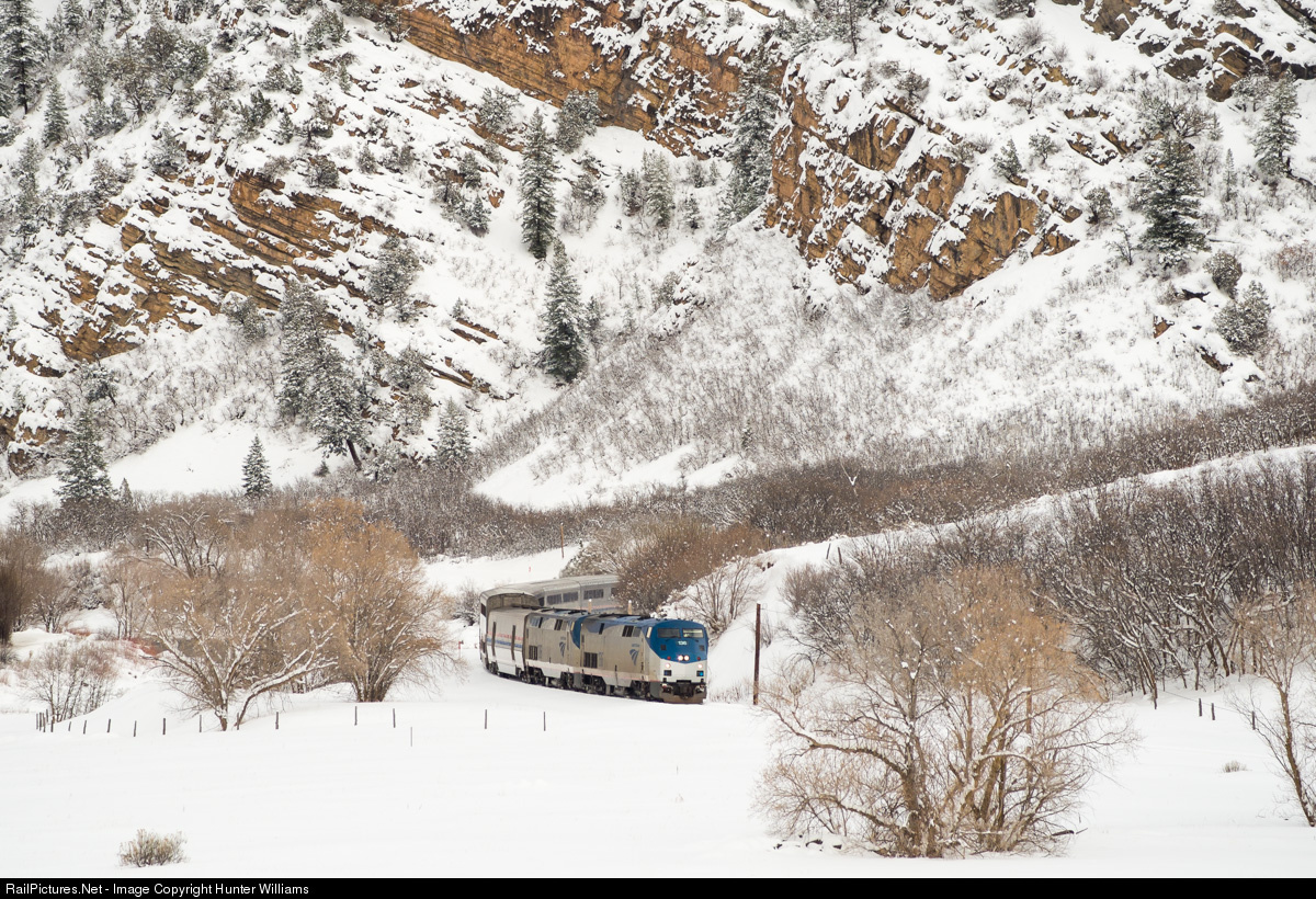 | Amtrak train 5, the westbound California Zephyr, rolls through Glenwood Canyon just before its stop in Glenwood Springs, CO on January 17, 2016. |
