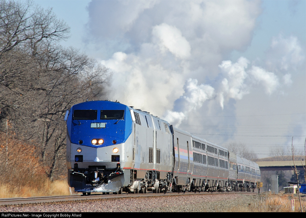 Amtrak 49, the westbound Lake Shore Limited blasts through Ogden Dunes, running over 3 hours late today. In the background, steam from the ArcelorMittal Plant in Burns Harbor can be seen. The temperature was hovering around 1°, but the "real feel" was -18°.