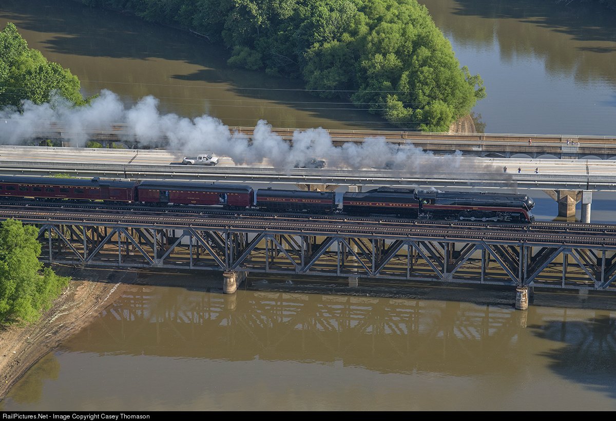 | Norfolk and Western class J number 611 leads NS train number 957 across the Yadkin River shortly after departure from Spencer, North Carolina, on its "welcome back" excursion towards home in Roanoke. |