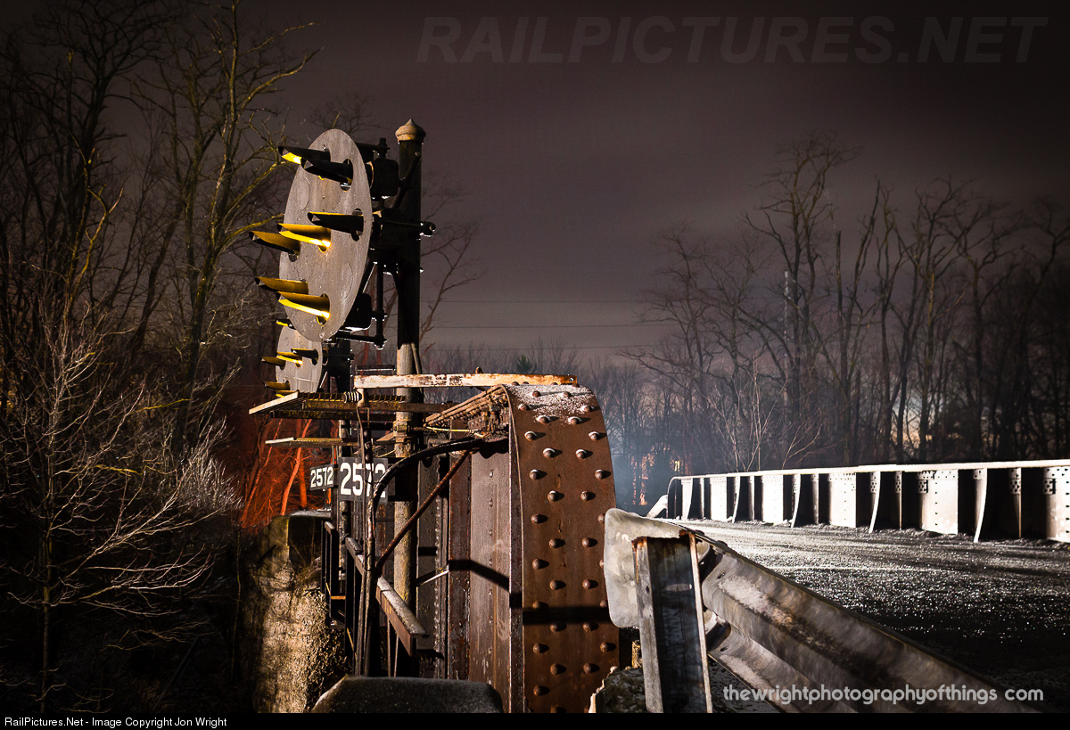 An eastbound approaches the bridge and lights up the signal heads and west face of the structure. The photographers vehicle sits parked out of sight lighting up the snow covered roadway ahead of it.
