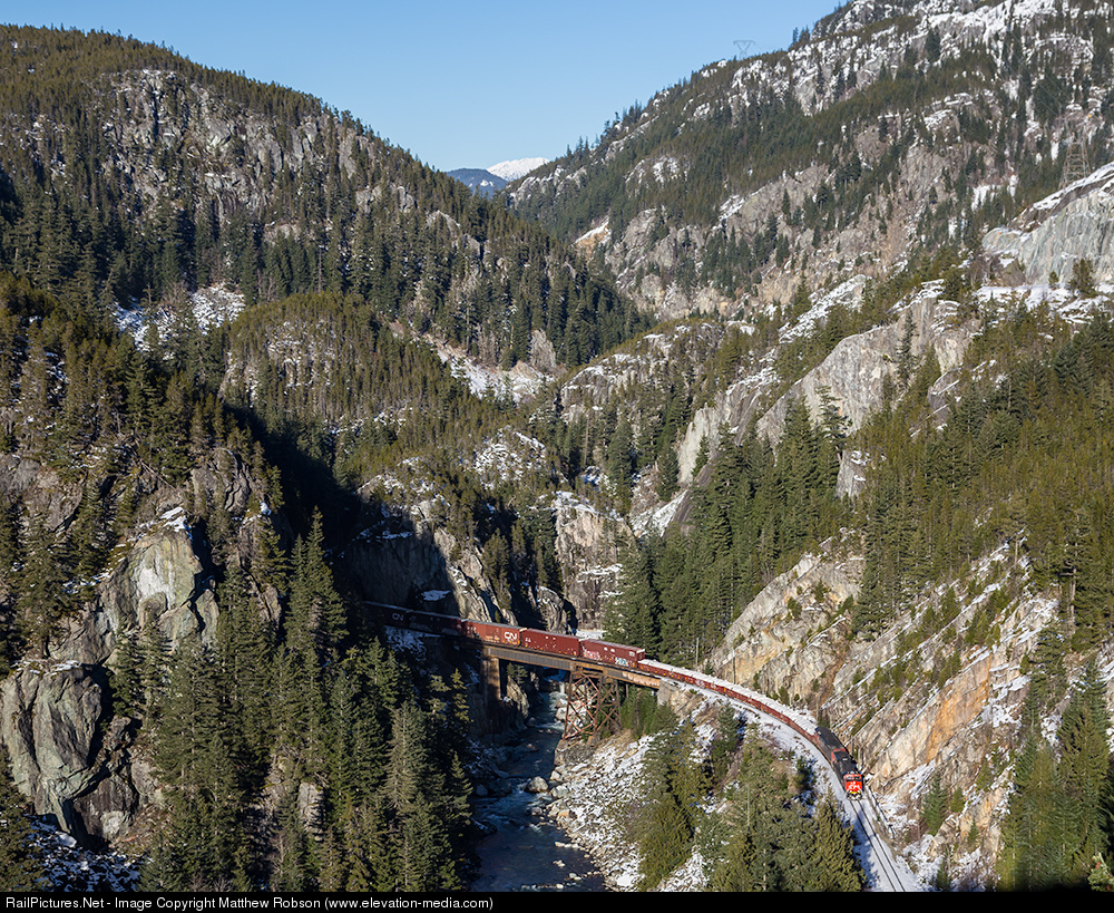 | Canadian National southbound #570 descends the steep grade through the Cheakamus Canyon along the former BC Rail Squamish Subdivision. This area is well worth the hike as you're treated to an assortment of natural stunning features and amazing engineering feats. All that is missing is the iconic British Columbia Railway... |