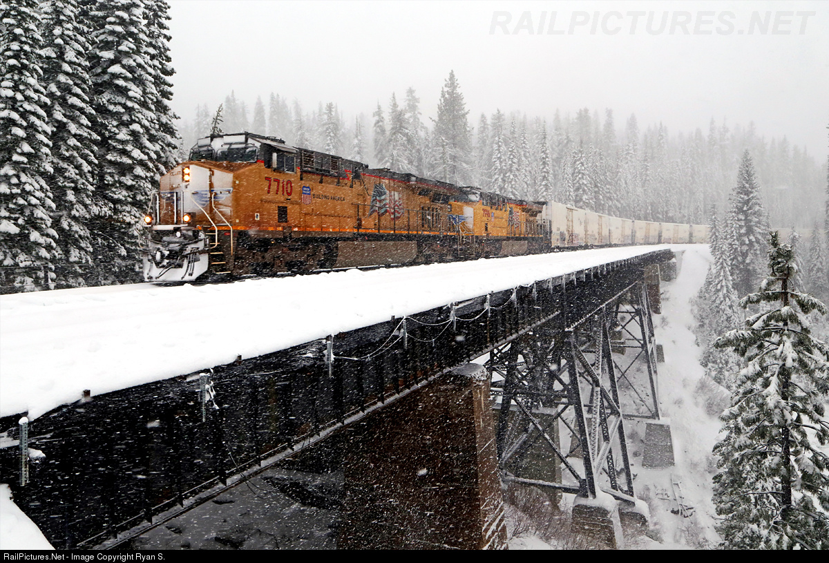 | As yet another winter storm moves across the High Sierra, bringing with it several additional inches of 'Sierra Cement', the sound of tonnage assaulting the western slope of the Sierra pierces the howling wind. East of the old SP station at Troy, Union Pacific's eastbound 'salad shooter' soars across Lower Cascade Trestle with a solid string of California perishable loads from the San Joaquin Valley tied to the drawbar. Reminiscent of the days when Donner Pass played host to dozens of Pacific Fruit Express reefer blocks. |