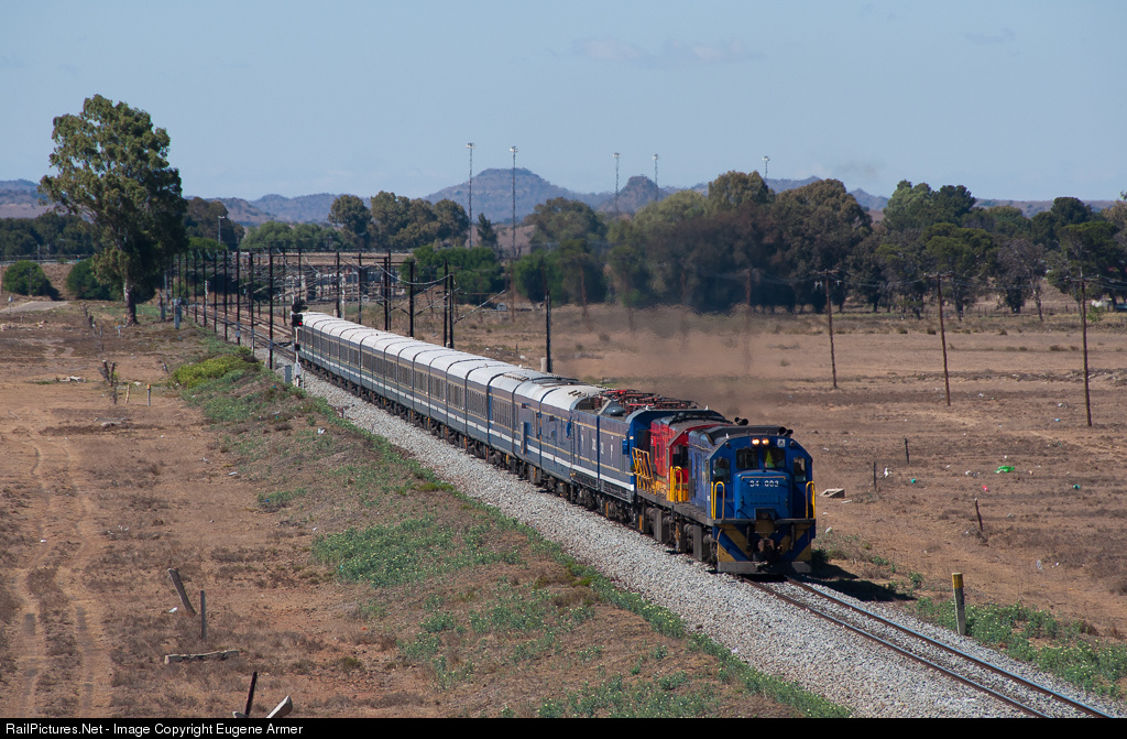 A week long maintenance closure of the Cape main line between De Aar and Kimberley resulted in the luxury Blue Train (as well as Rovos Rail and the Premier Classe) being rerouted via Noupoort and Bloemfontein on their journeys between Cape Town and Johannesburg. This provided a very rare opportunity to photograph the Blue Train behind diesels in the southern Free State, where the northbound 19-car train is seen departing Springfontein towards Bloemfontein. Tucked in behind the pair of class 34 diesels are the two Chinese dual-voltage class 20E electric locomotives allocated to this train, 20 031 and 20 032, being dead-hauled between De Aar and Bloemfontein. The diesels are 34-003, one of the first three 34's imported in 1971 from GE in the USA, and 34-914 from the 900 series, which does not have the saddle filter on the roof behind the cab.