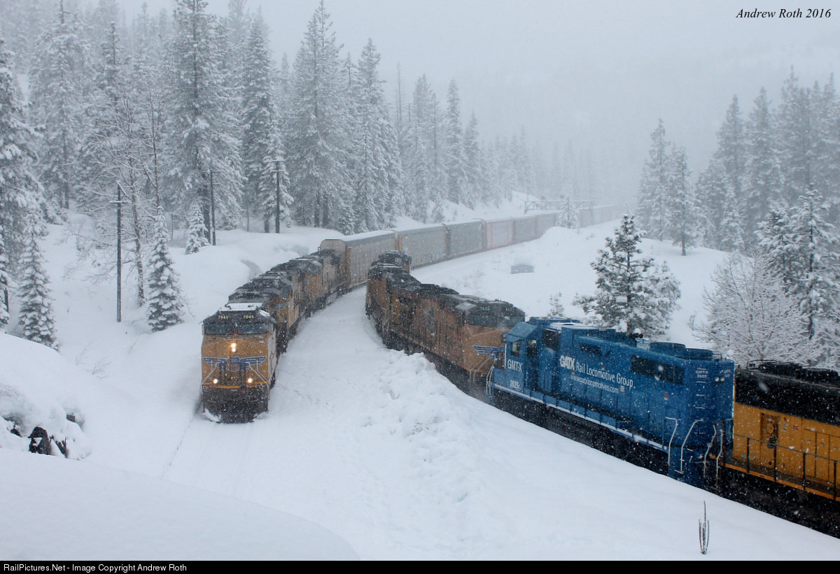 In a stunning display of winter mountain railroading, UP's Roseville to Roper manifest is finally on the move, passing an Oakland-bound stack train with a GMTX GP38-2 in consist looking a bit out of place. The Roper-bound manifest has just recovered from going into emergency at Yuba Gap, with an empty grain train following closely behind it, and Zephyr 5 holding at shed 10. Behind the stack train is a flanger set, holding at Norden. Just another day on the hill!