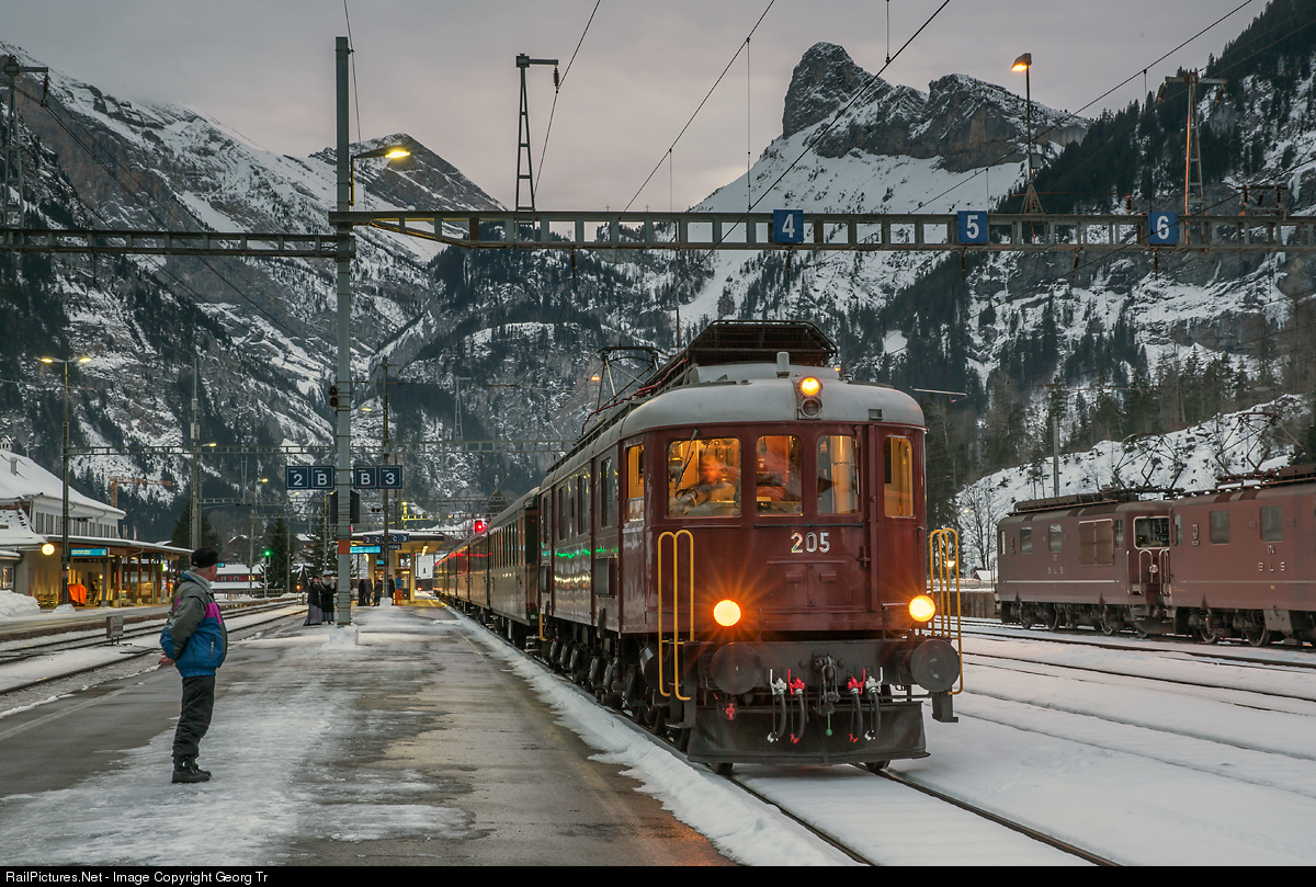 As night falls in Kandersteg, the train of the BLS with Ae 6/8 # 205 and the Swiss Classic Train cars is ready for departure back to Basel. The guests made a visit of the "Belle Epoque" event which is celebrated every january. In the background 3448 meter high Rinderhorn (left) and the striking Gällihorn (right, 2284 meter).