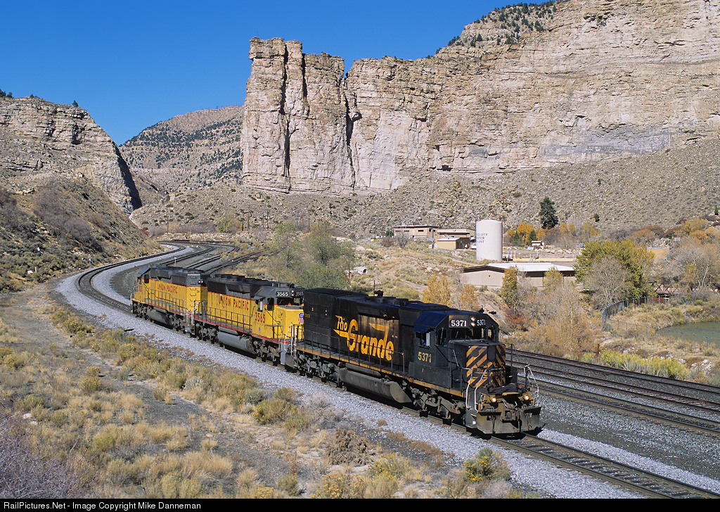 After pushing Union Pacific MNYPV to Kyune on the Price River grade up Soldier Summit, a helper set drifts downgrade through Castle Gate, Utah, on October 24, 2007. The last Rio Grande locomotive still in original paint and number on the vast UP system at this point of time was SD40T-2 No. 5371, leading UP SD40-2s Nos. 3565 and 3121 on the helper set heading back to appropriately-named Helper.