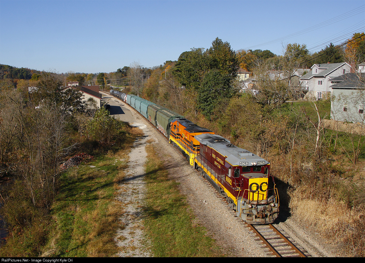 The Ohio Central Cambridge Turn (Zanesville, OH-Cambridge, OH) is passing through the town of New Concord as seen from the RT83 overpass in town. This operation runs M-W-F out of Zanesville. This job will switch one to two industries on its' eastward trip to Cambridge. Usually on duty at 0700. The power on this job changes quite often.