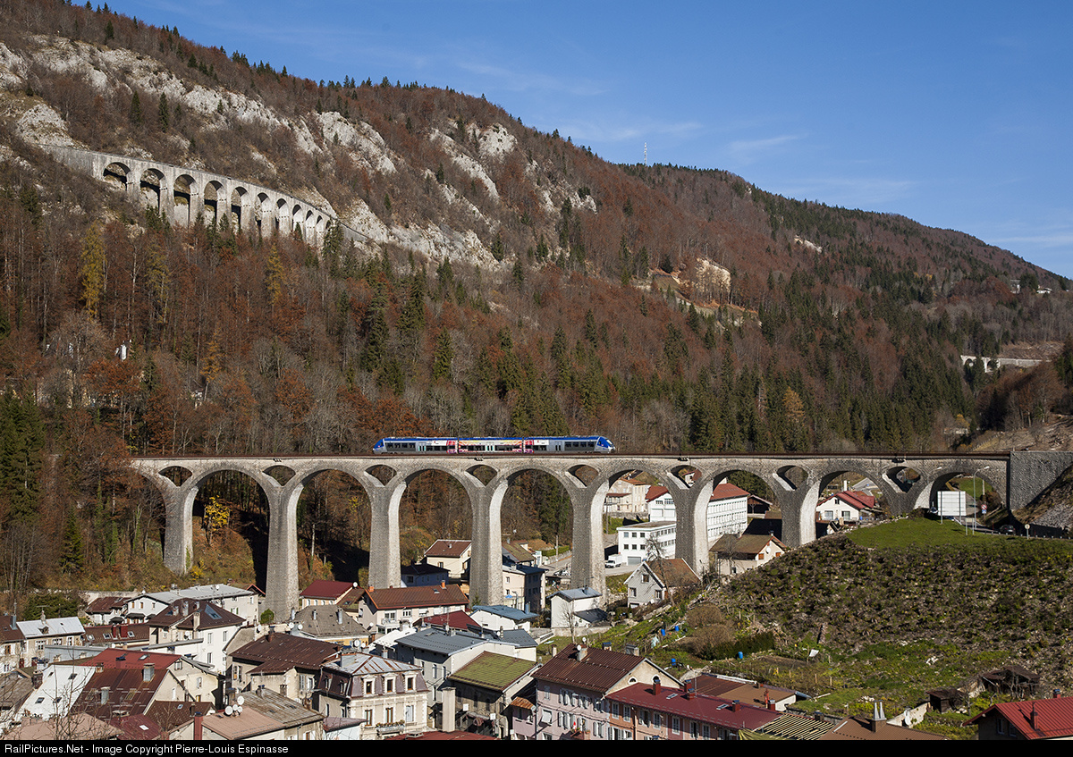 | The regional train from Dole-Ville to Saint-Claude is crossing the viaduct of Morez which was constructed by the well-known French architect Paul Séjourné. |