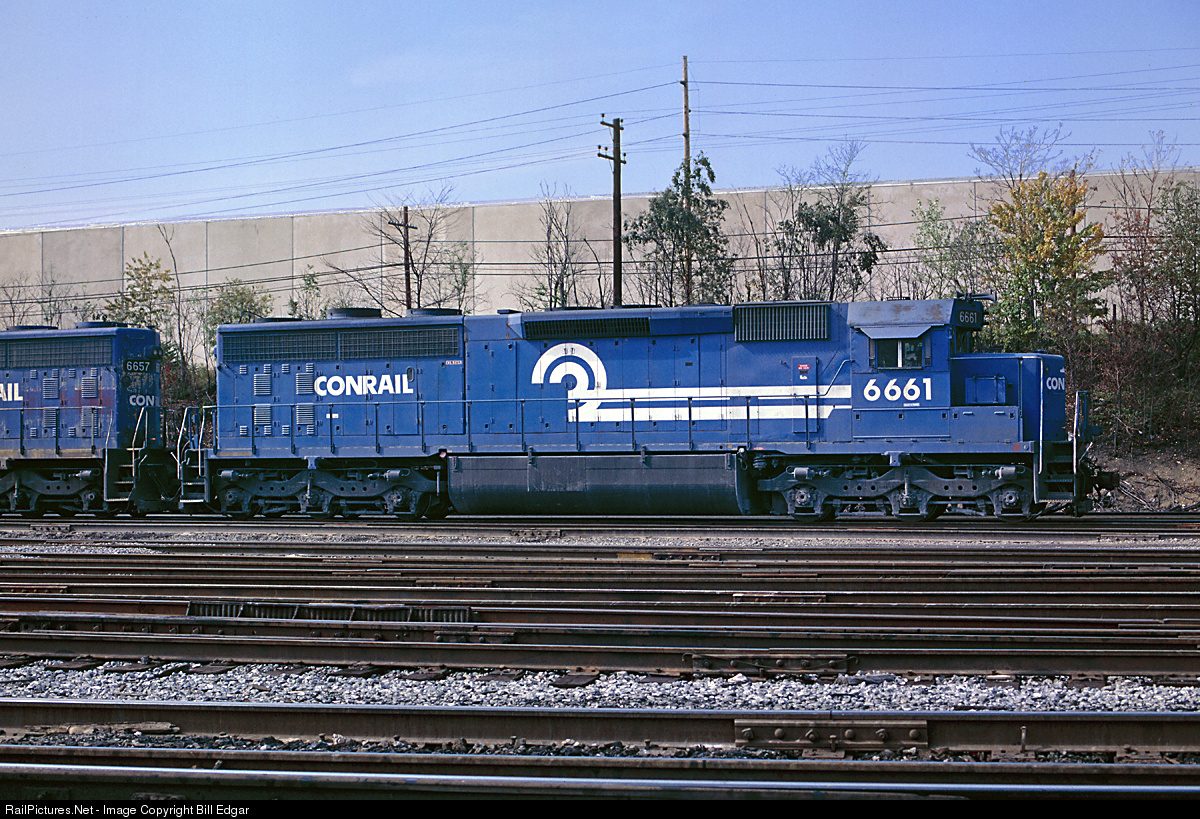 CR 6661, a former Erie-Lackawanna SD45-2 suns itself outside Juniata Shops at Altoona, PA in October 1982. A recession in the U.S. had slowed rail traffic and there were a number of these units stored here at this time. Mate 6657 gives a hint of its previous owner as the relatively new blue paint is already peeling off. Note the large fuel tanks that E-L had favored on late model locos in order to reduce re-fueling on New York area-Chicago hotshots.