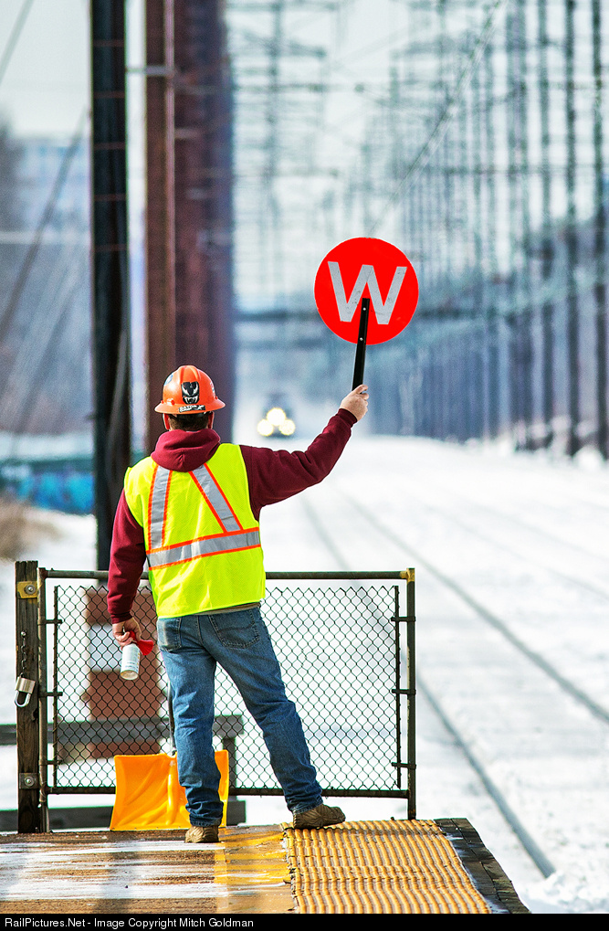 A ROW crew member alerts his associates of an in-coming NJT train (seen in the distance) during a snow removal operation at Edison, NJ.