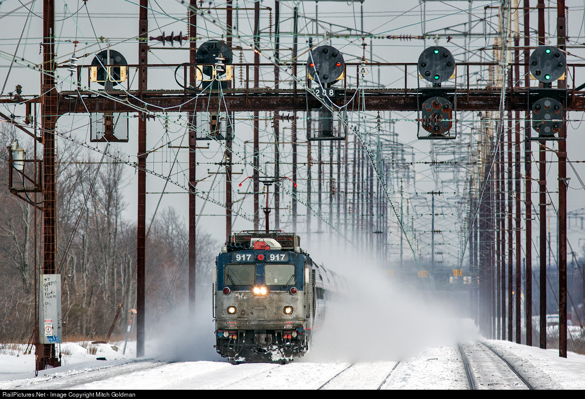 Soldiering on - Amtrak AEM-7 #917 roars westbound (south) through Edison ducking the position lights just ahead of the NJT station. The plume of snow in its wake is remnants of the season's first big storm from the weekend prior.