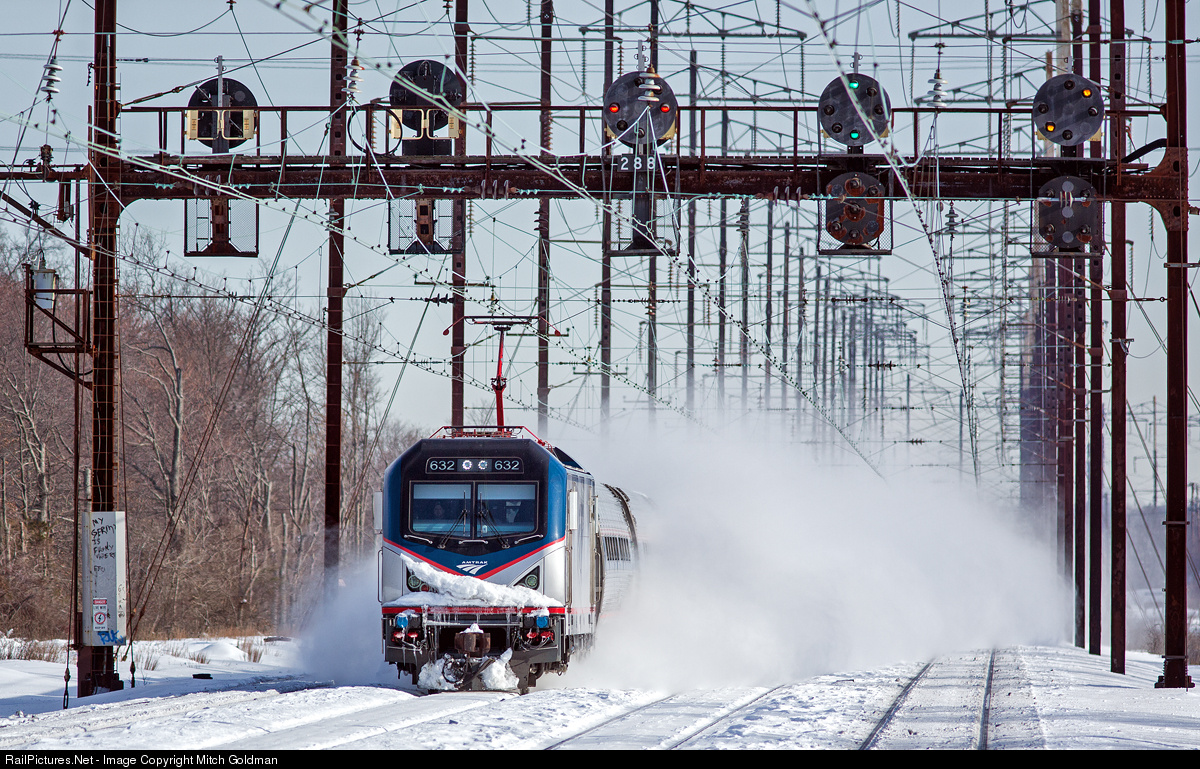 With some snow from the north, an Amtrak Cities Sprinter, led by AMTK #632, races south (Amtrak west) through Edison, NJ leaving a plume of snow in its wake. Just above are the still surviving PRR style position lights thought Amtrak has long since replaced the clear lenses with its colored lenses.