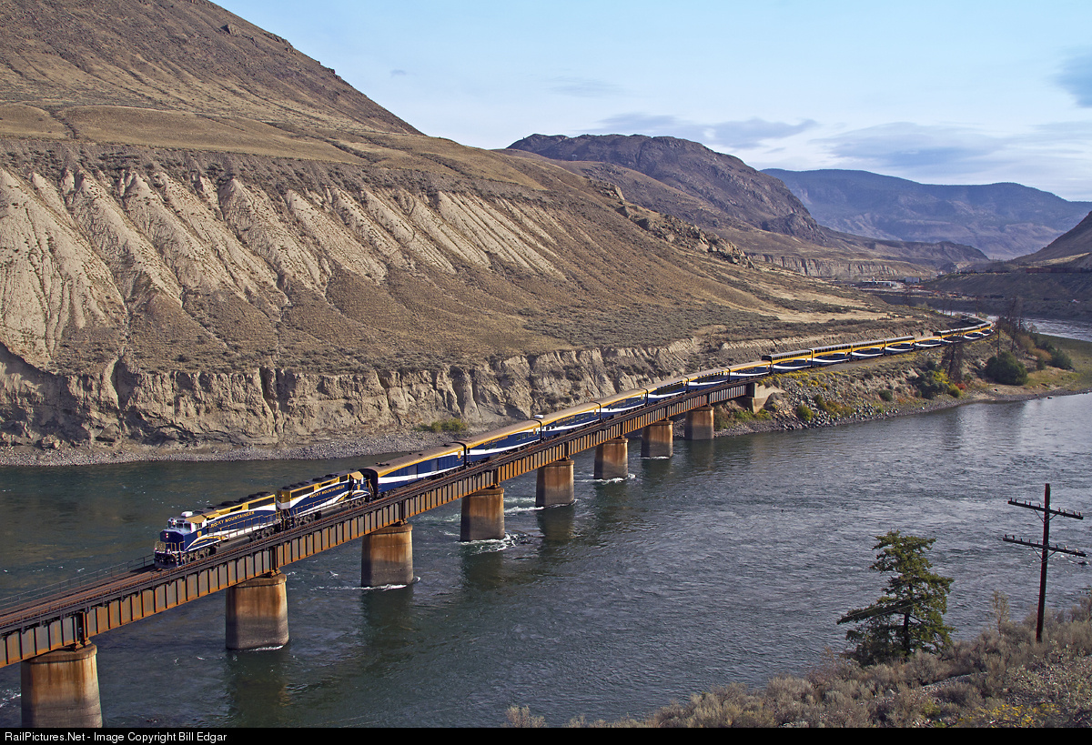 The Rocky Mountaineer crosses the Thompson River as it heads west towards Ashcroft and its trip down the Thompson and Fraser River canyons. The train in its current livery is affectionately known as the "screw train".
