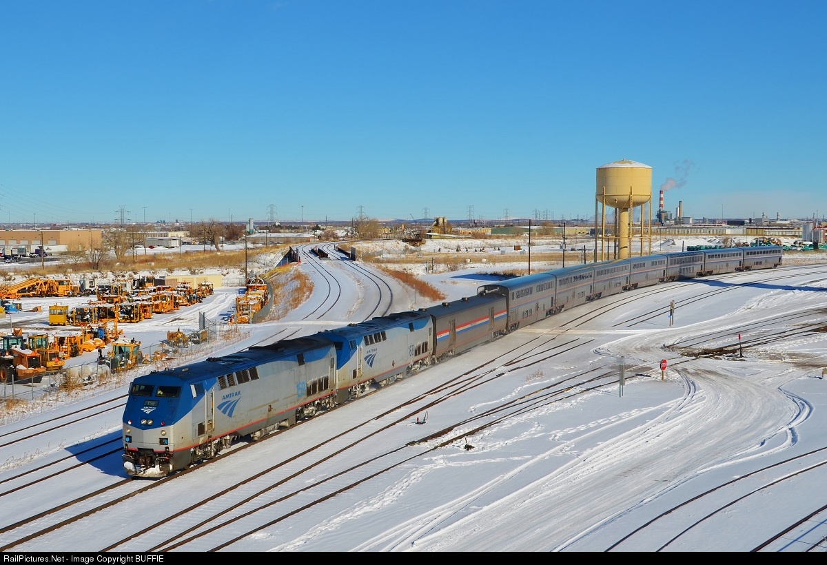 | Usually the California Zephyr leaves Denver Union Station early in the morning. On this day, due to weather delays coming from Chicago, the Zephyr left the Denver station six hours late. This afforded the opportunity to get this pic as the train left the north end of the UP's North Yard, with the sun pointing in the right direction. |