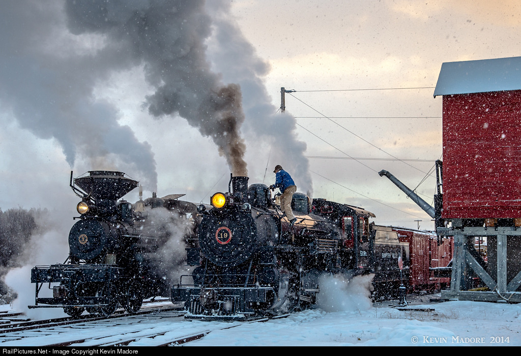 We'll be needing the sanders..... Sumpter Valley Engineer Eric Wunz makes one last check of the sand supply on Mikado #19 as he prepares depart McEwen and head west toward Sumpter. A snow squall has suddenly blown in from the hills to the west, obscuring what was promising to be a nice sunrise. It's going to be that kind of a day, where the sun's out one minute and it's snowing to beat the band the next. Those rails are going to be slippery and Eric wants to make sure they're ready for it. On the adjacent siding, the crew of Eccles Lumber #3 makes similar preparations before heading out with a local work train. It's a bitter cold morning in early February, but it's just another day on the SVRy.