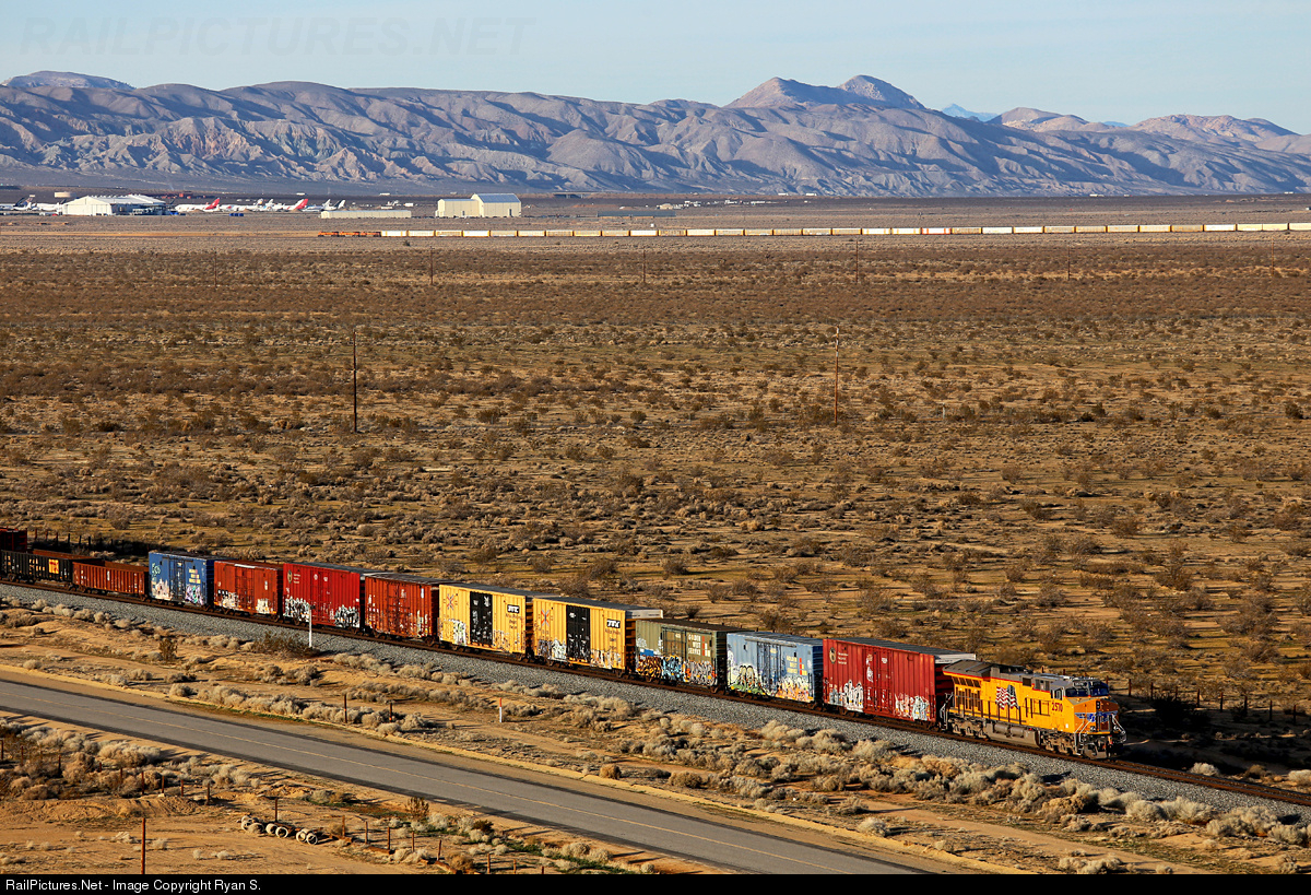 | Racing for South Mojaveā¦.marching across the desert towards Mojave for the assault on the eastern slope of the Tehachapi grade, UP's 'class' ET45AH #2570 brings up the rear of the westbound MWCRVC as it passes Fleta on UP's Mojave Subdivision. In the distance BNSF's westbound V KCKRIC is also bent on Tehachapi, leaving Sanborn on former Santa Fe iron. Soon both trains will be 'in line' for the journey over the formidable Tehachapi's. |
