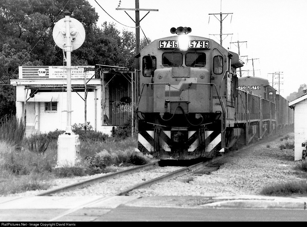 Prior to the 1967 SCL merger, ACL and SAL competed ferociously for Florida's phosphate traffic. Here, a pair of U36B/Mate sets are westbound with phosphate hoppers on an ex-SAL line, and about to cross an ex-ACL line in the middle of the street.