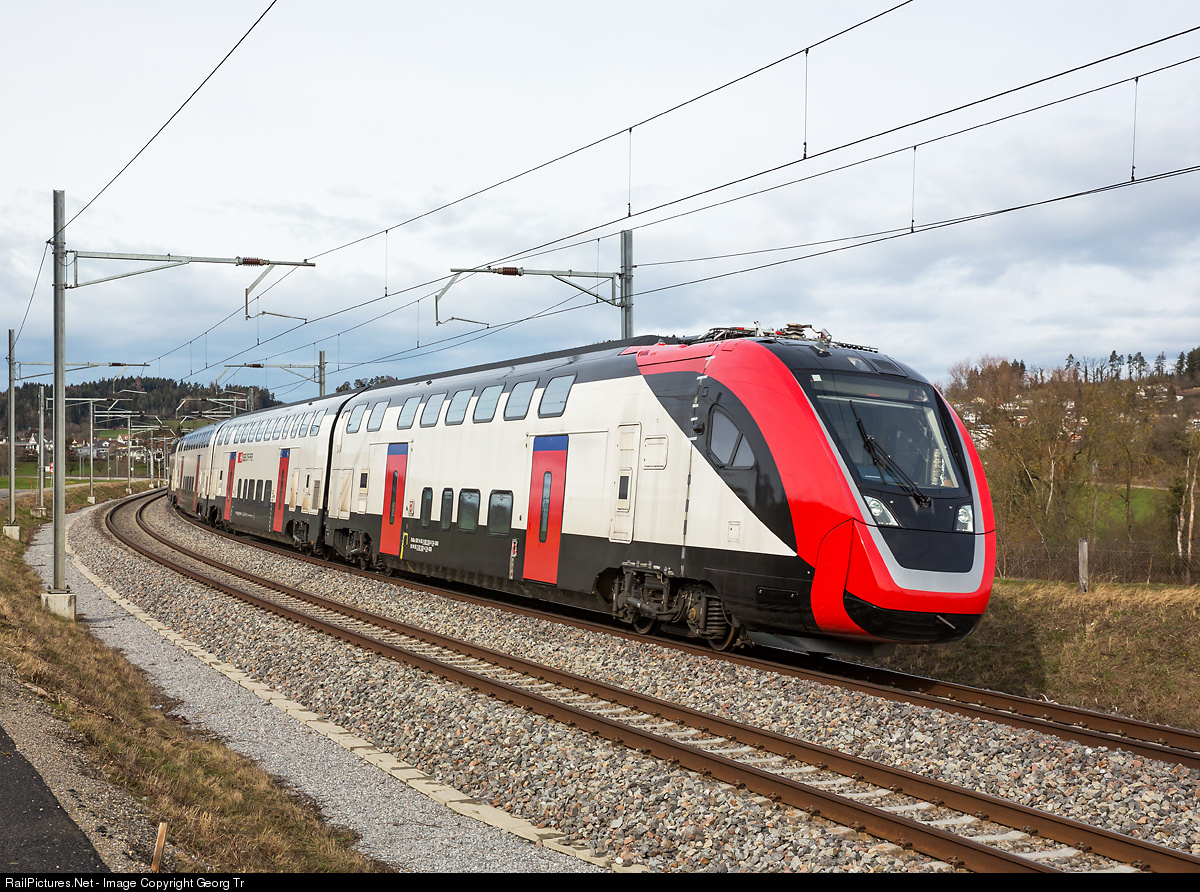 | RABe 502 # 203 double deck Intercity from Bombardier for the SBB, testing the new WAKO system. The WAKO is a system for the compensation of the natural roll movement of a carbody, integrated into the existing secondary suspension. The system allows a speed increase in curves of ~15% and therefore allows for shorter journey times with lower investment in infrastructure. |