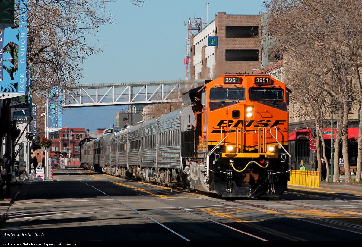 With the street-running section completely devoid of automobile traffic, BNSF's Superbowl special strolls through the square in grand fashion with big-wigs a plenty on board. A number of curious onlookers stopped what they were doing to admire the beautiful and classy stainless steel coach consist, to whom the engineer is seen waving. This was my first time seeing BNSF south (east) of the OIG in almost 5 years, when the Warm Springs Local ran through for the last time.