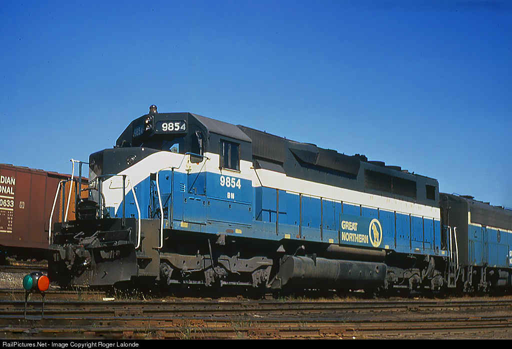 Westbound Great Northern SDP40 9854 with BN numbers at Seattle, Washington May 24,1970. Photo from my collection, no photographer listed on slide.
