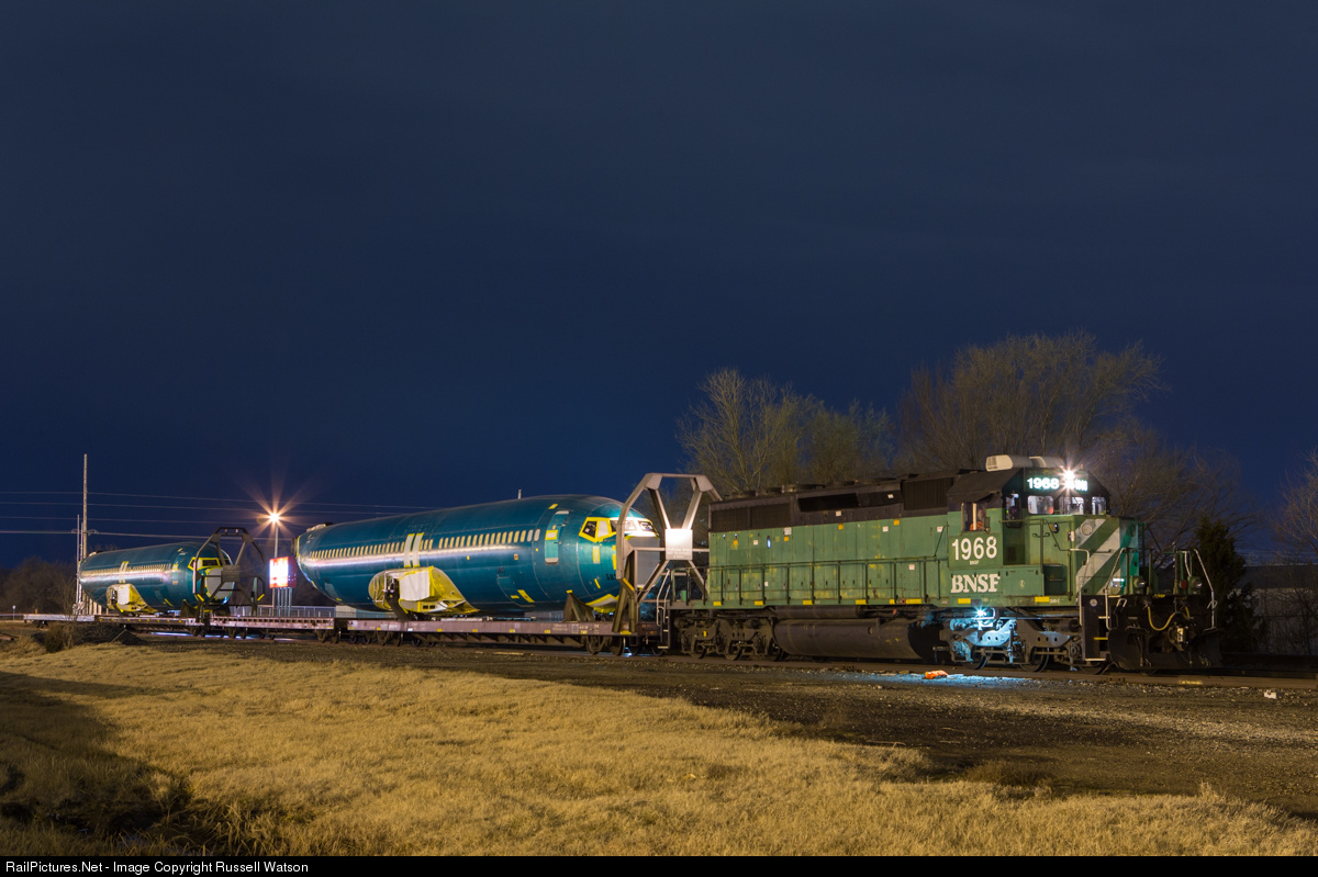 | The Boeing job finishes up the week with a ex-BN SD40-2, BNSF 1968. This nights train only had the fuselages. None of the skyboxes. The Boeing job pulls out these Boeing 737's from Spirit Aerosystems every Monday through Friday. |