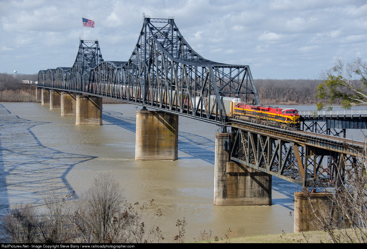 An eastbound Kansas City Southern train crosses the mighty Mississippi at Vicksburg.