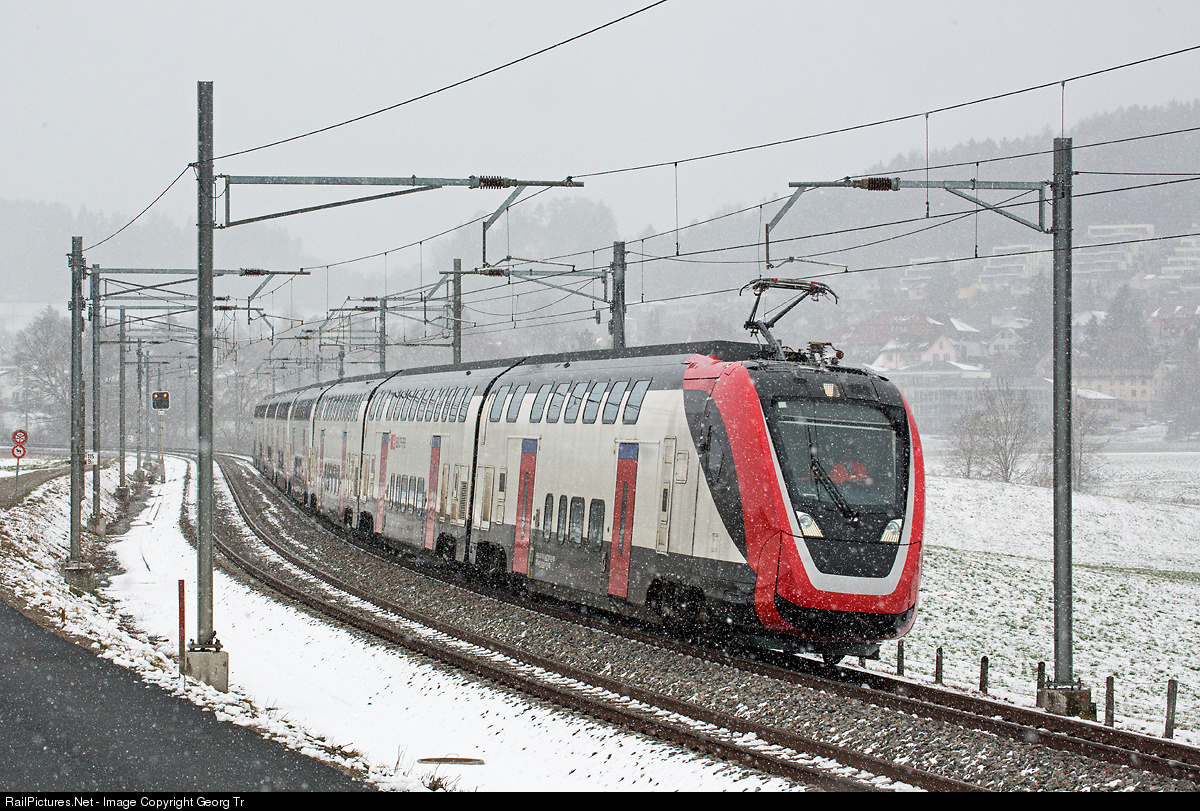 | Test run of the new double deck Intercity train from Bombardier for the SBB, RABe 502 # 203, with WAKO (cant compensation) system, between Eschlikon and Sirnach. If the tests run in accordance with the programm, the train probably is running up to 135 km/h instead of 115 km/h for regular passenger trains here (140 km/h for tilting trains). |