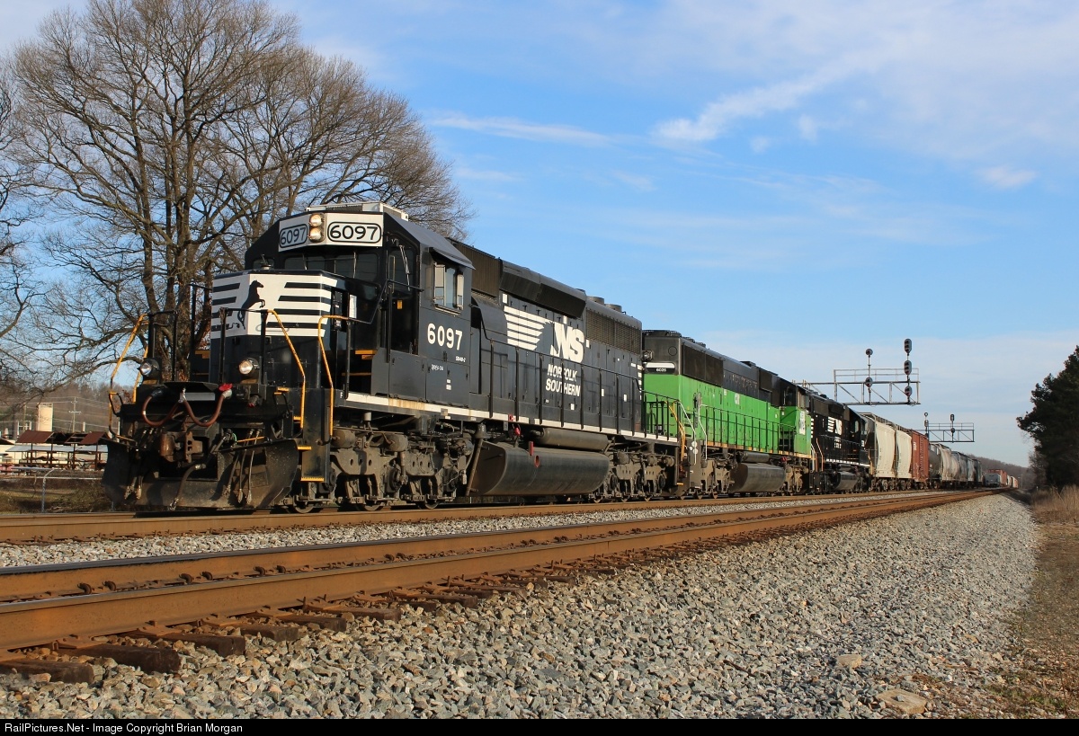 Southbound Norfolk Southern manifest train #371 has stopped at the Industrial Boulevard grade crossing at CP "Walnut", milepost 42 of NS's Atlanta North District, to make a setoff in the small yard located just south of downtown Dalton, Georgia. Today's train is led by NS SD40-2 #6097, CBFX SD60M #6025, and NS SD40-2 #3530. The #6097 was originally built for Norfolk and Western in March 1975.