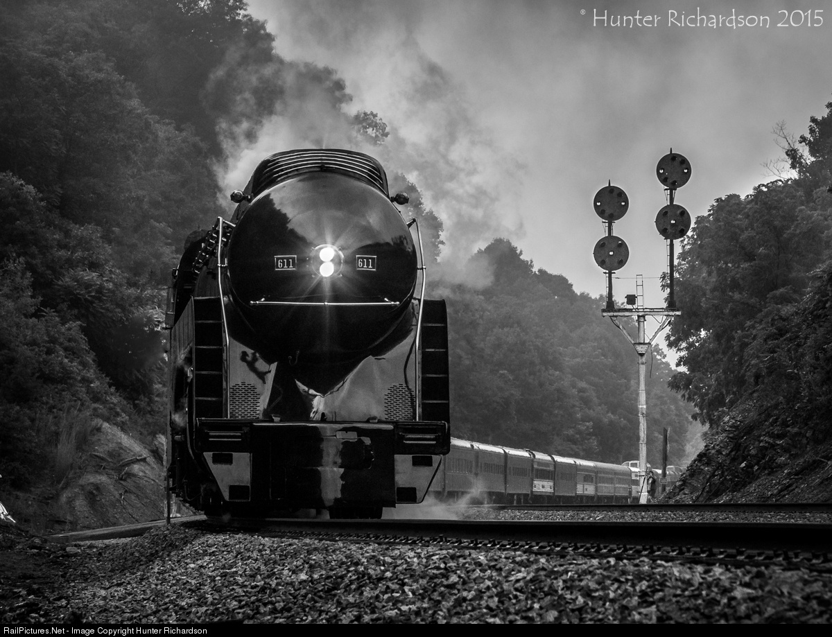 | Climbing the famed "Blue Ridge Grade", Norfolk and Western J Class #611 puts on a show on July Fourth weekend, framed by a one of a kind N&W CPL. |