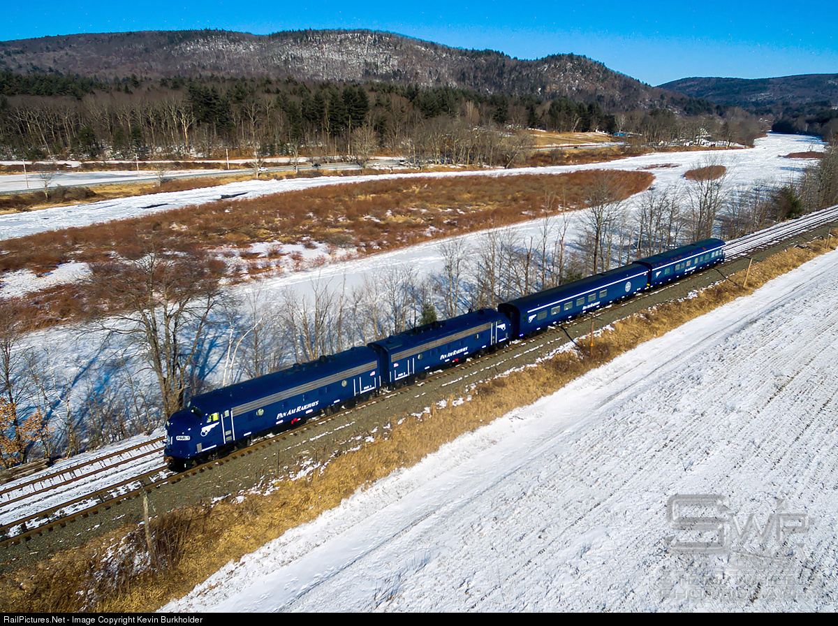 Pan Am Railways FP9As PAR-1 and -2 head westbound through Buckland, MA during a 0-degree F rare winter run of the Pan Am Railway office car special train on Sunday, February 14, 2016. The train was moved from East Deerfield, Massachusetts to Mechanicville, New York for a planned occupied eastbound run on February 15.