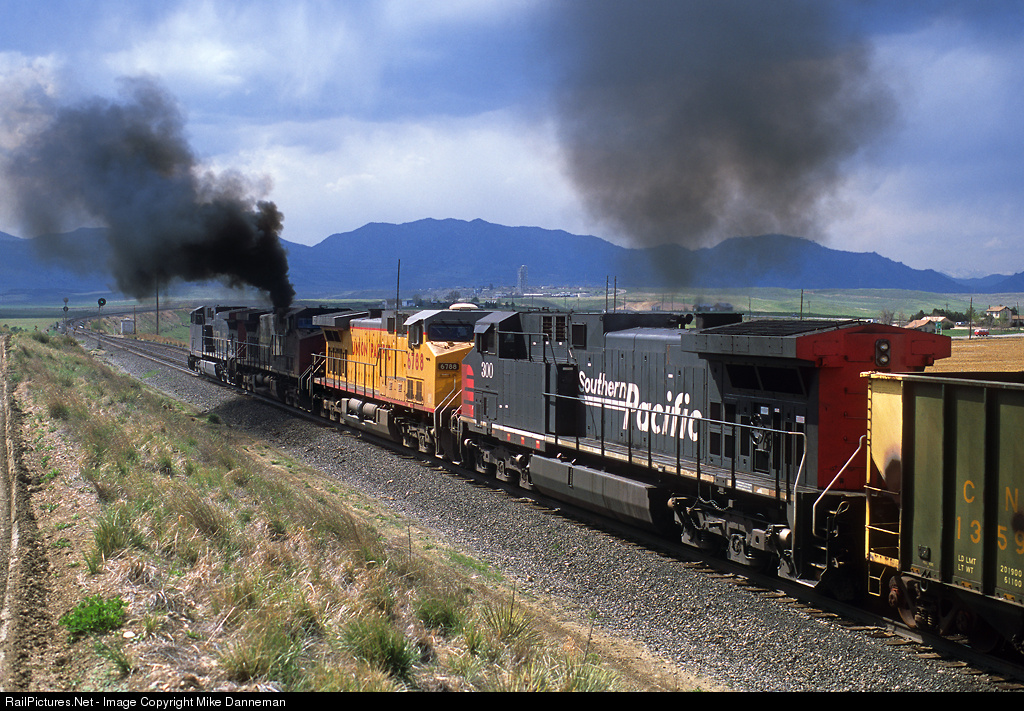 Charging west on the main line with a clear block, a Union Pacific coal train heads for the Front Range mountains at Leyden, Colorado, on April 27, 2001. Now that the lead Southern Pacific AC4400CW has cleared its throat, the trailing SP GEs smoke it up too. At this point of time on UP’s former Rio Grande Moffat Tunnel Subdivision, UP power could still be the minority.