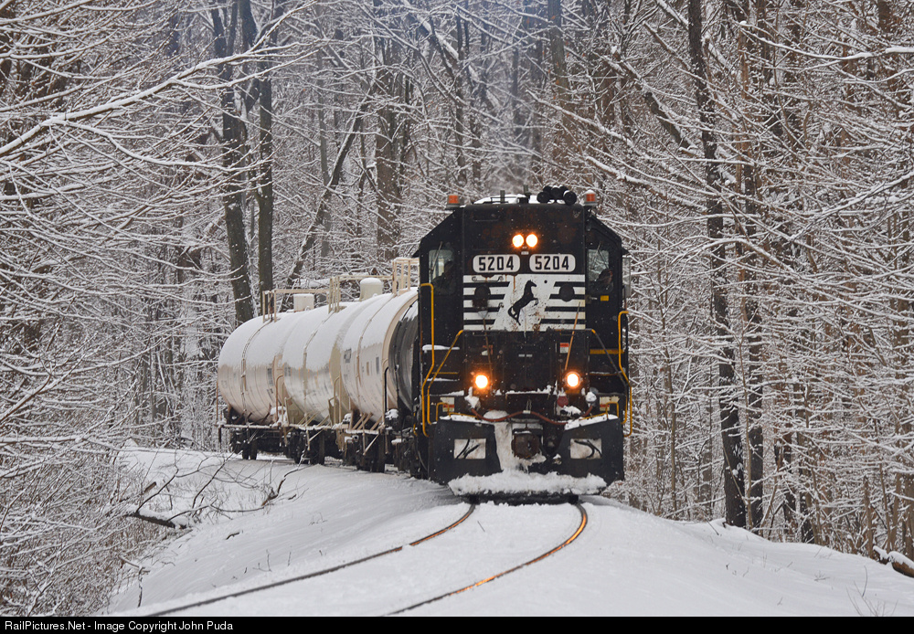| In a beautiful winter scene, C64 heads west to go serve some local industries in Fairport Harbor as NS 5204 leads 4 cars through the snow covered woods on the east side of Painesville. |