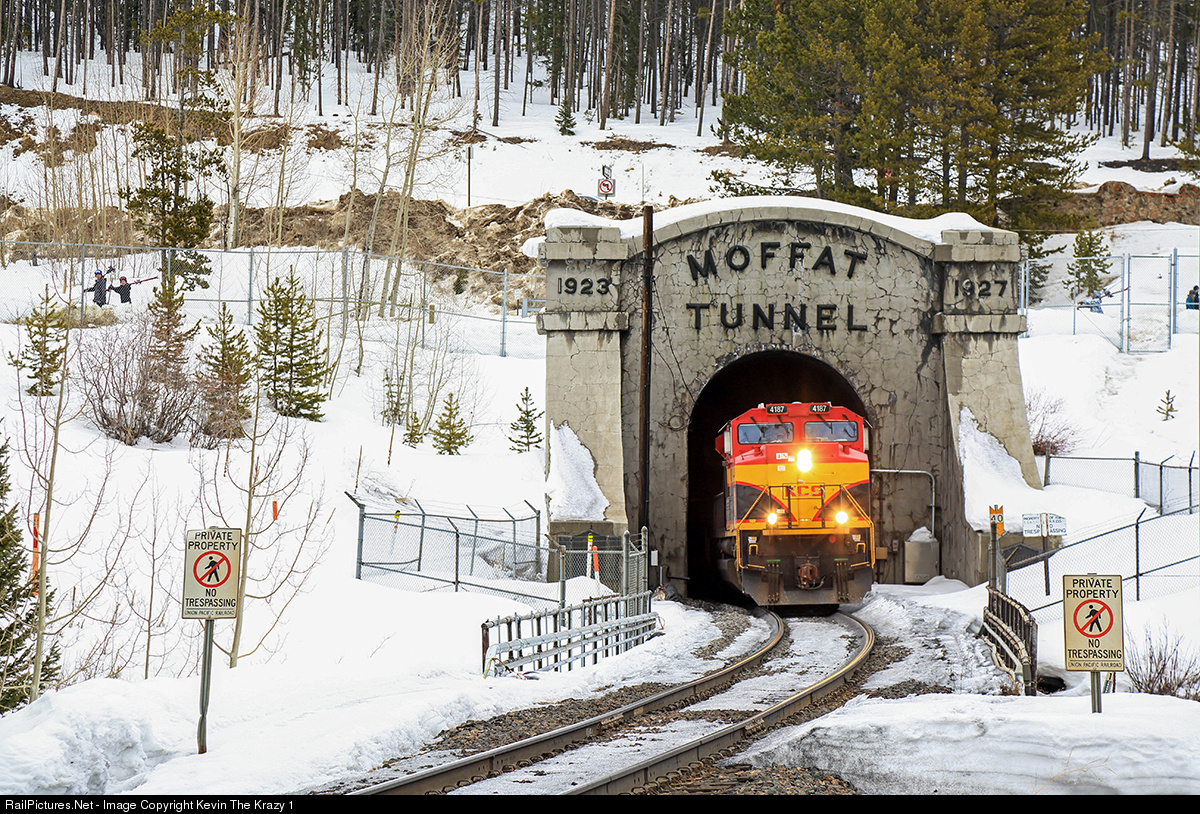 | A pair of KCS SD70ACe's poke out the west portal of the 6.2 mile long Moffat Tunnel as skiers from Winter Park head back to their cars after a rather warm day on the slopes. The KCS pair made it out from Kansas City on this oil train headed for Wash, UT. |