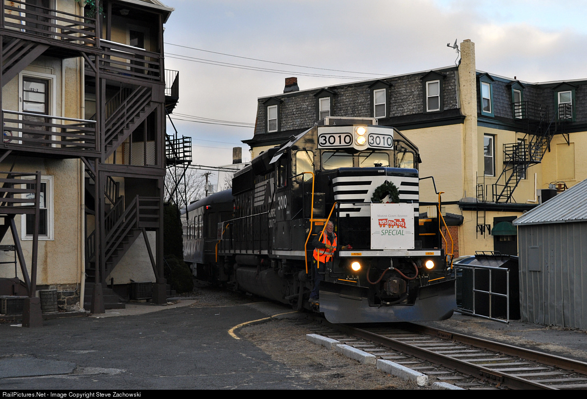 On a quiet and otherwise calm Saturday in Dover, NJ the residents of these particular apartments awoke to the sound of a train literally in their backyard! The train is deadheading to Rockaway, NJ where the power would be rearranged and run West along two of the M&E branches collecting toys for the Toys for Tots program. |