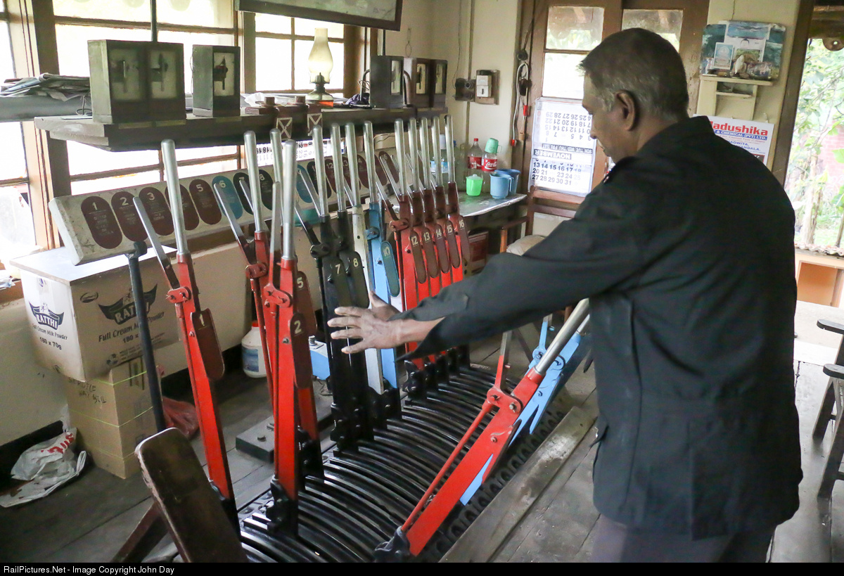 In time honored tradition, the signalman deftly returns the "Down Main Inner Home" signal to the "on" (or "stop") position after a Kandy-bound train has cleared the station. British-built mechanical signaling still dominates the "Main Line" of Sri Lanka Railways in 2016, with occupancy of the single track controlled by possession of a token which is hooped up to the driver at the start of each section.