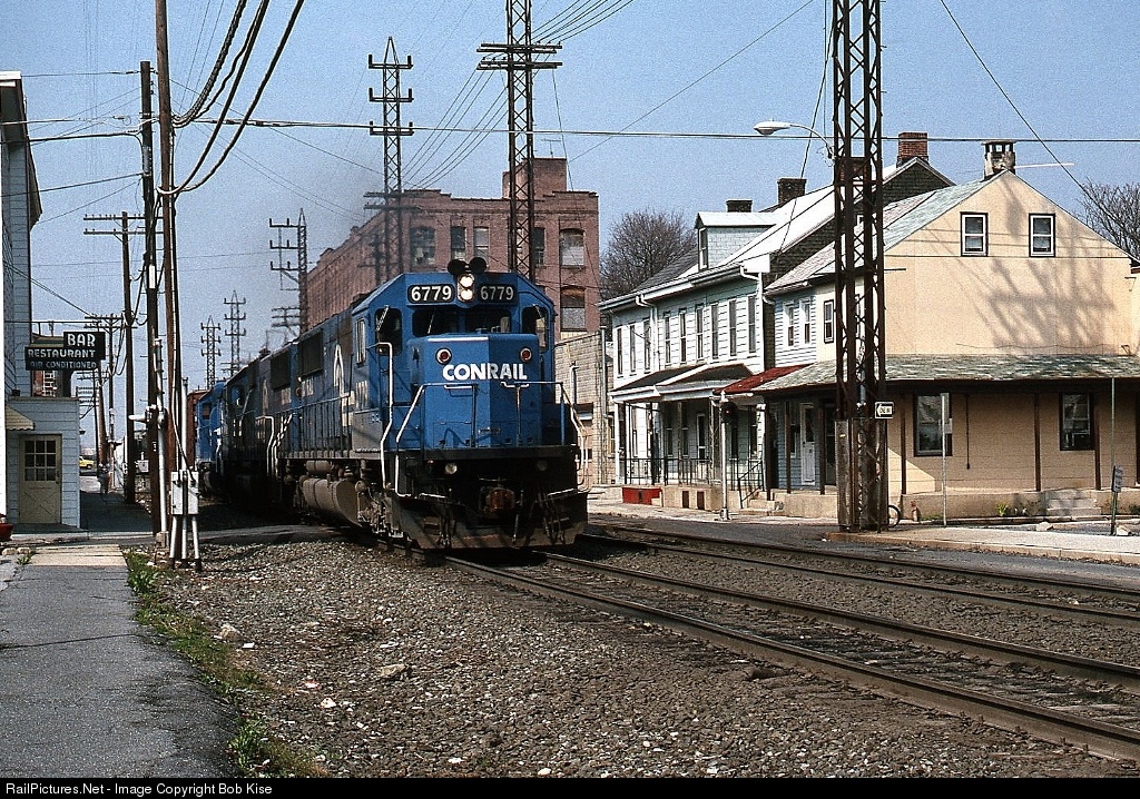 An eastbound manifest on the old Reading RR Lebanon Valley Branch passes the Railroad House Bar and Restaurant on the left and the row homes along Scull Street. Today, this scene is dominated by the twin viaducts carrying 9th and 10th Streets (PA Rt. 72) over the busy NS Harrisburg Line. The old factory in the background was torn down to make way for the viaducts, which allowed NS to close four grade crossings- Gannon Street, 9th & 10th Streets, and Partridge Street. In the 1980s, this was a "semi-quiet zone," with trains limited to 25 mph through the city with mandatory engine-bell ringing, but no horns from 4th Street to 12th Street. Today, track speed is 40 mph, and the trains blow their horns at all crossings. The Railroad House Restaurant (now closed) was well-known for its steaks and a special fish dish, called "The Queen of the Valley," after the Reading's name train which stopped at the nearby station on 8th Street.